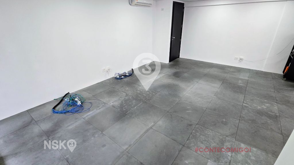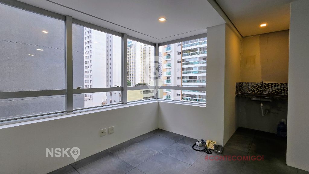 Sala para Locação com Piso Elevado, uma copa e equipada com Ar-condicionado, Clara e Arejada, possui varanda. 2 Vagas