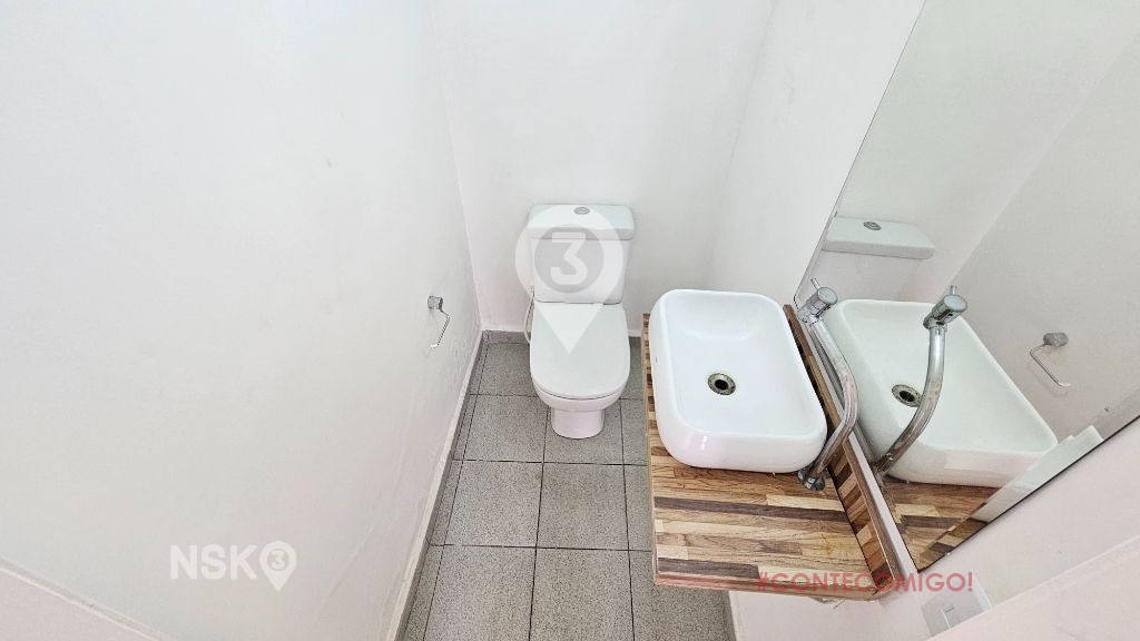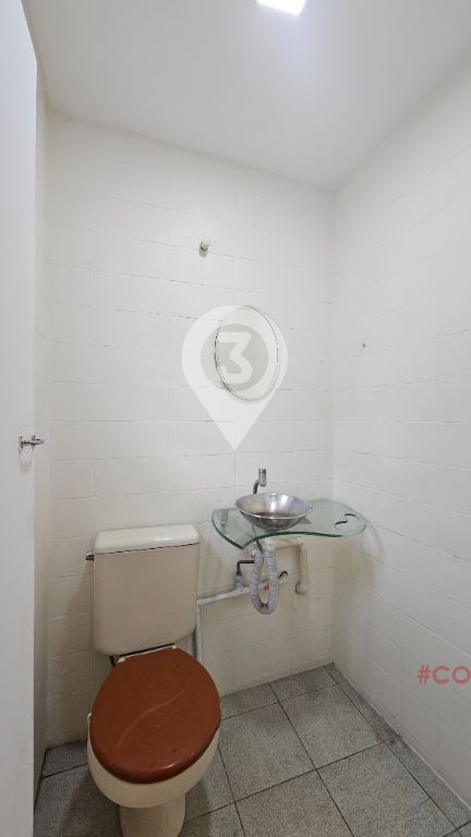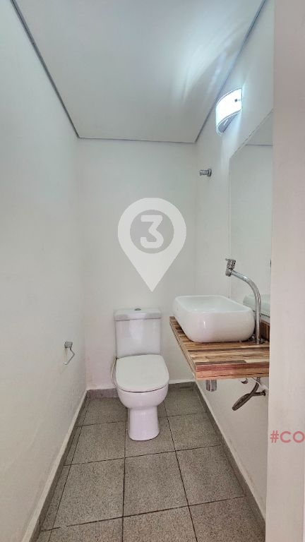 Sala para alugar com 75m², recepção, 2 salas, cozinha, 3 banheiros e mezanino.