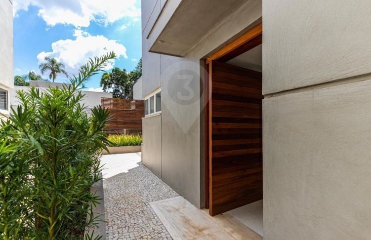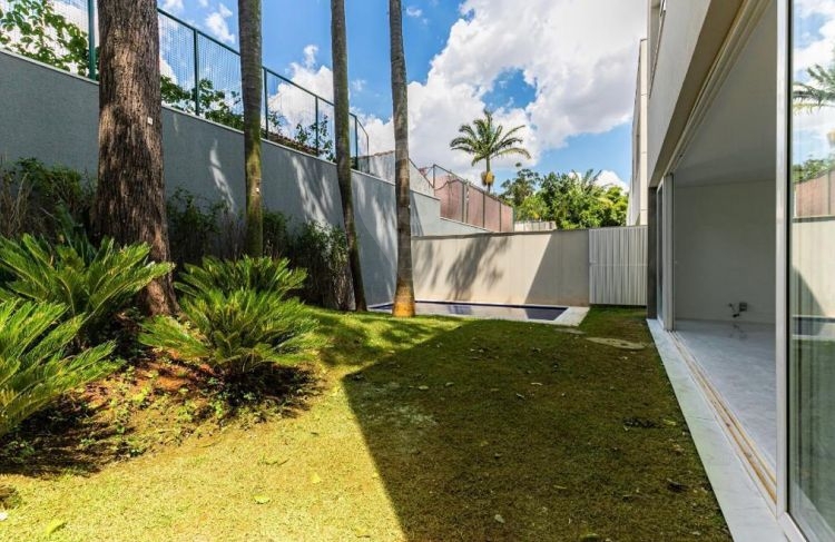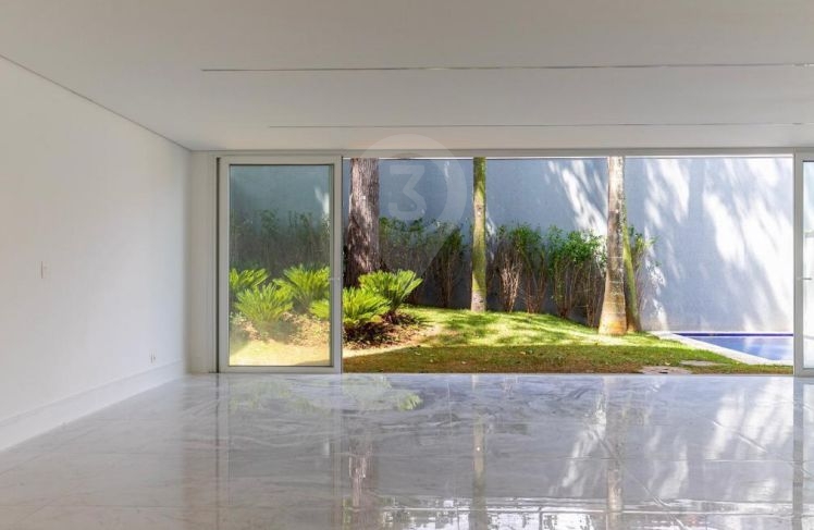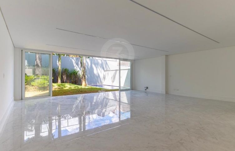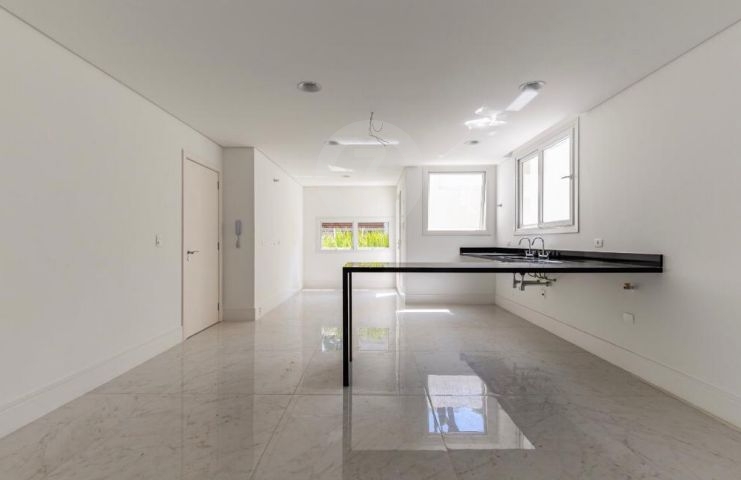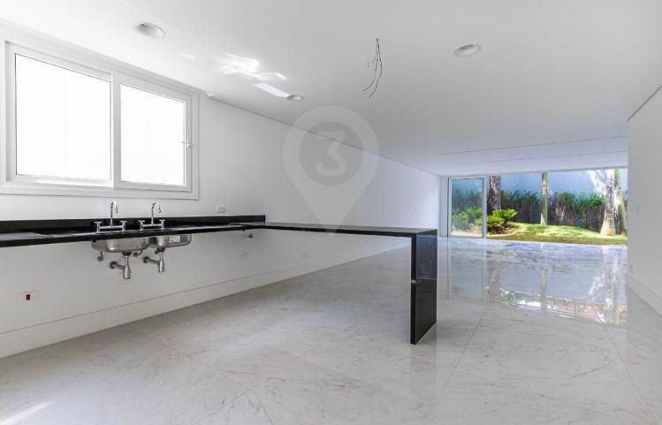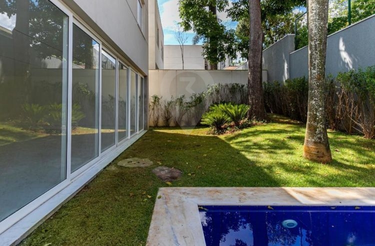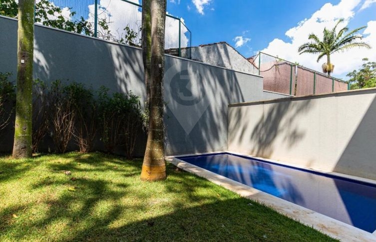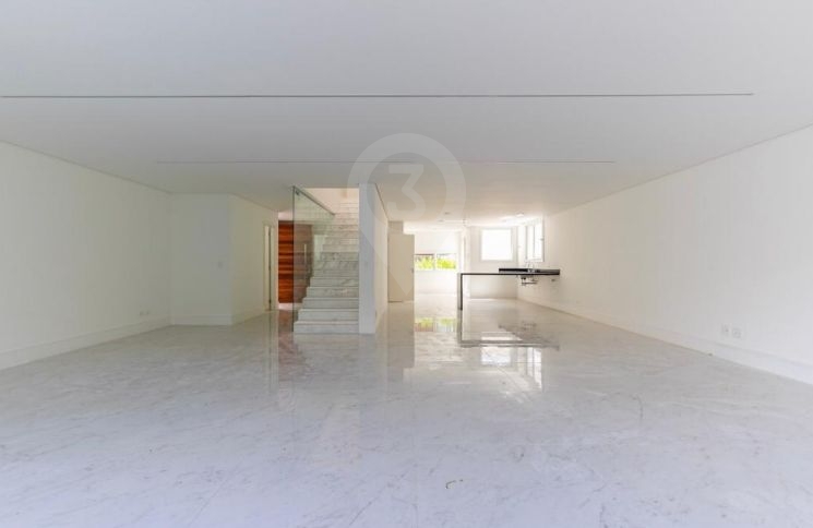 Amplo living integrado com a cozinha, balcão em granito preto, quintal com jardim privativo e piscina . O imóvel possui área de serviço e 5 vagas de garagem.