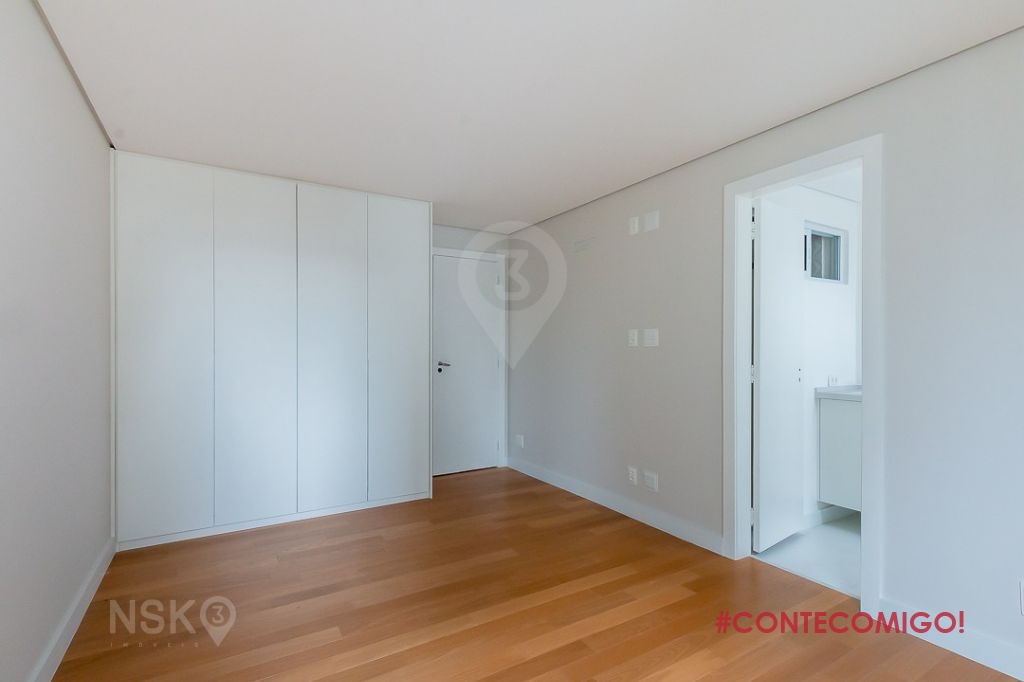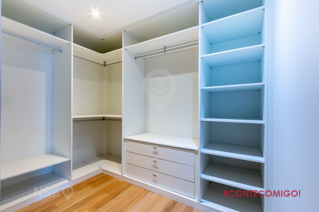 A suíte master, ao fim do corredor, foi modificada e acomoda um walking closet absurdamente grande. O closet que tem dimensões de dormitório, originalmente, era o segundo dormitório de serviço. Incorporado para comodidade e conforto do casal, tem espaço de sobra, possui armários planejados, prateleiras, cabideiros e sapateira, atende a qualquer fashionista.