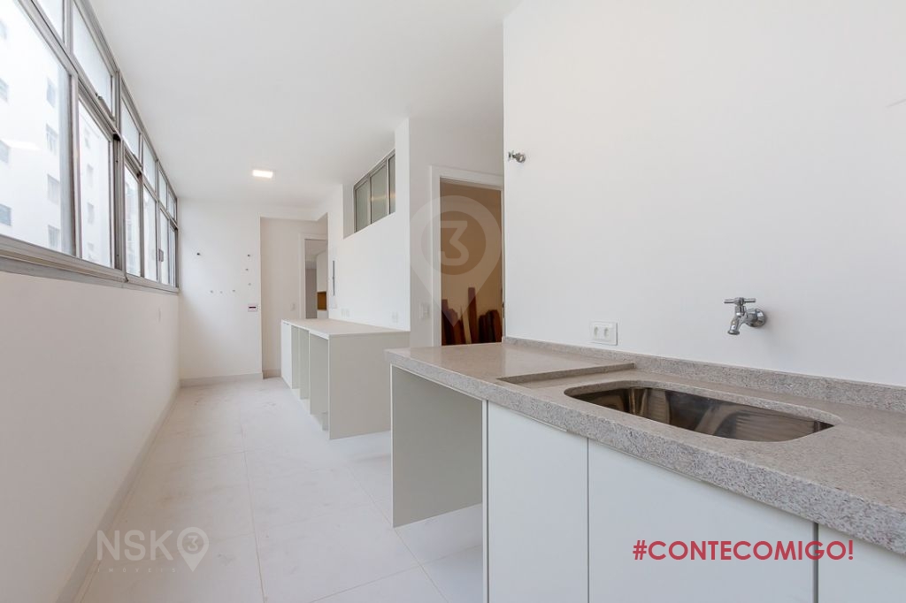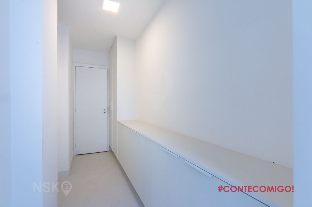 A área de serviço é ampla e bem arejada, com armários abaixo de uma longa bancada, dois tanques, dormitório e banheiro de serviço e todo o sistema de ar-condicionado pronto para instalação ao lado da entrada de serviço. Um corredor ao lado da porta da cozinha, repleto de armários planejados, pode ser usado como dispensa, dando acesso ao corredor que leva à parte íntima e quartos.