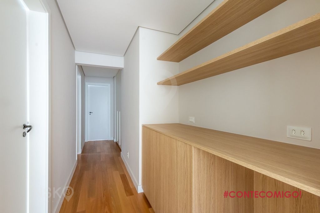 O corredor está equipado com armários e prateleiras de marcenaria de primeira qualidade com muito bom gosto no estilo bem clean. À esquerda, está a primeira suíte, com piso em tábuas de madeira, grande janela, banheiro claro e bem acabado, além de armários com 4 portas que seguem o alto padrão da marcenaria. A segunda suíte também à esquerda possuí o mesmo estilo, também com ar-condicionado. Essas duas suítes foram planejadas e reformadas, nesse moderno projeto, trazendo comodidade a todos os dormitórios.