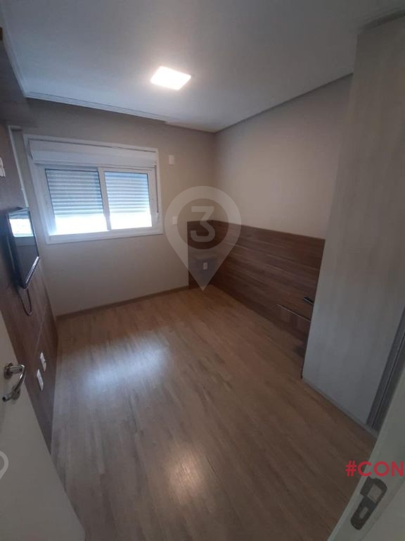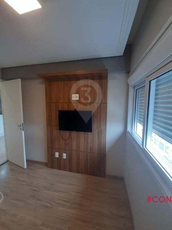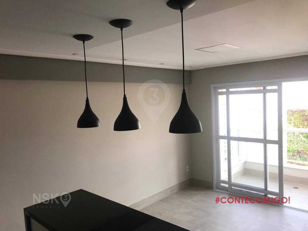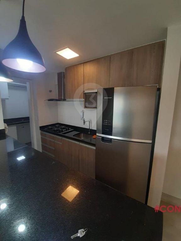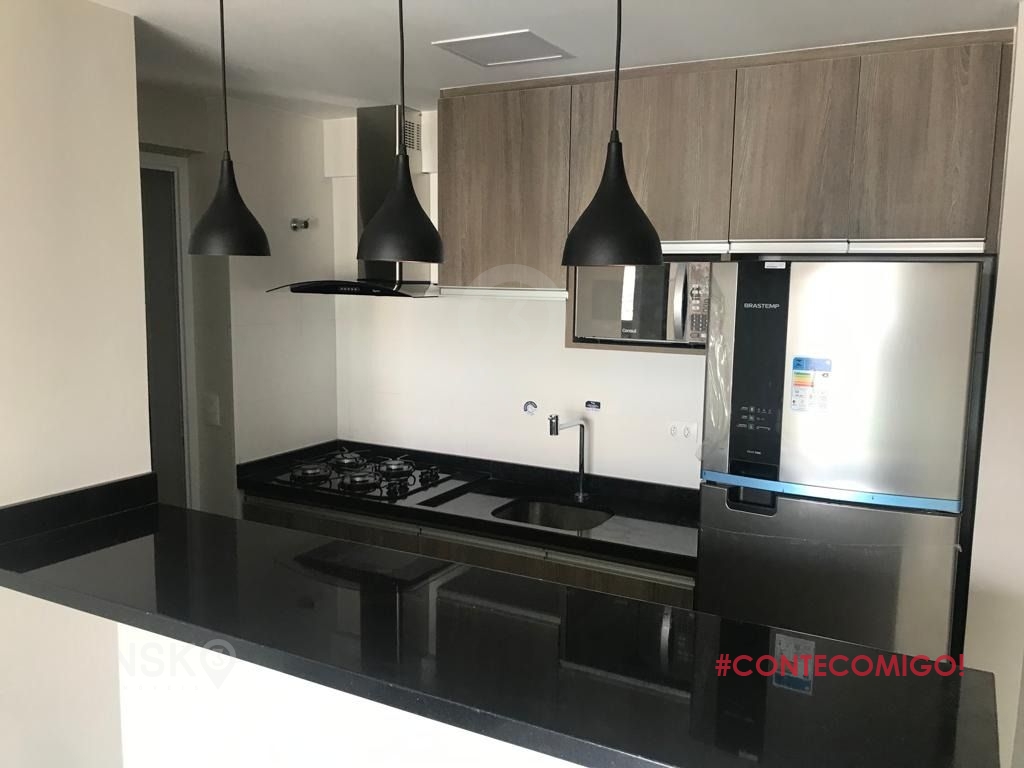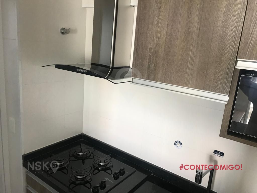 Apartamento em andar alto, varanda com piso frio, armários embutidos no dormitório, banheiro, cozinha e lavanderia, banheiro com box de vidro, TV, cooktop, depurador de ar, geladeira e microondas.