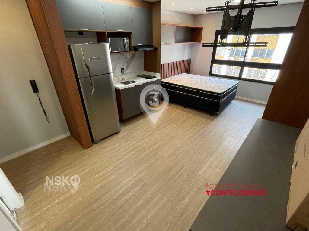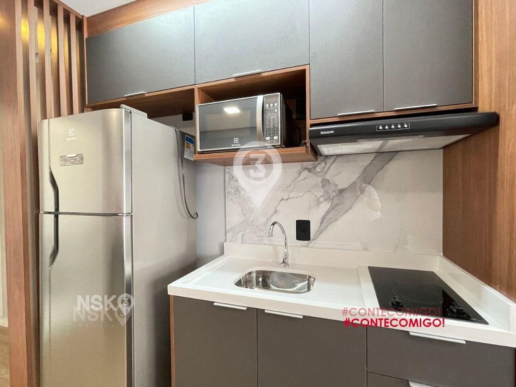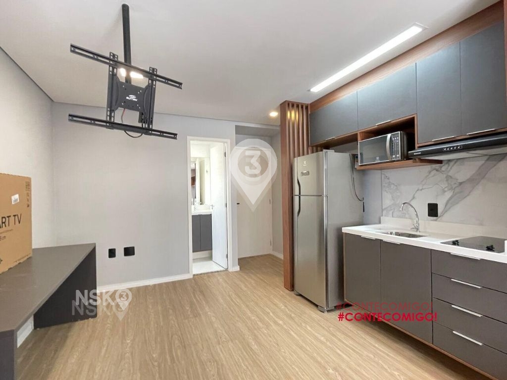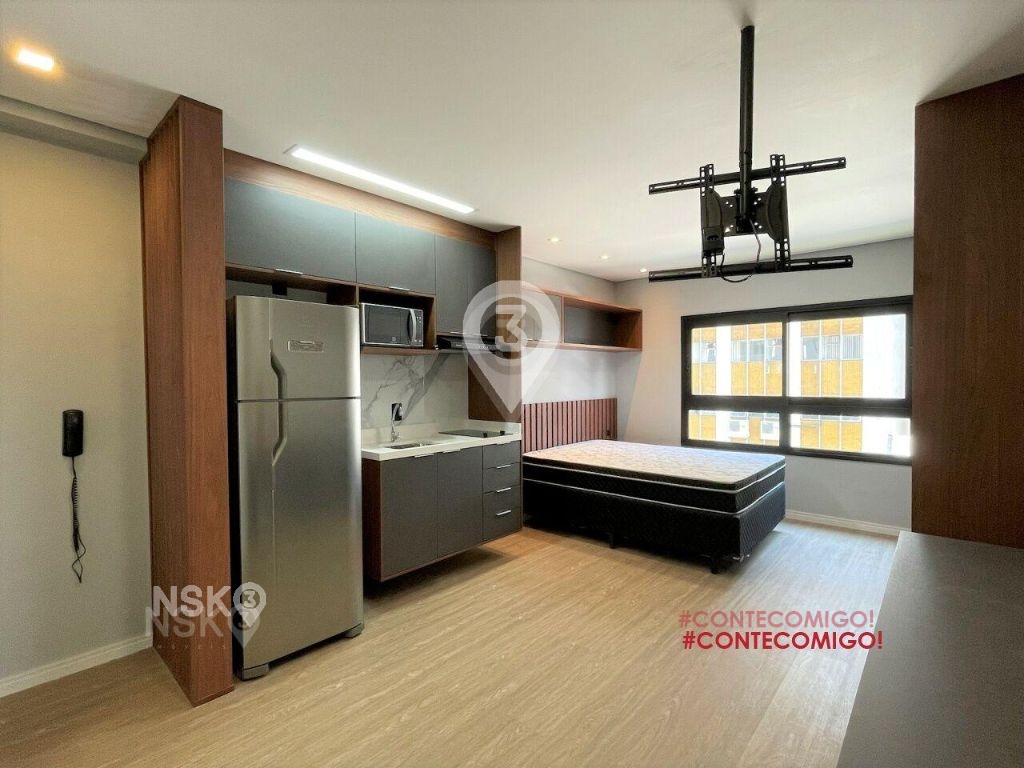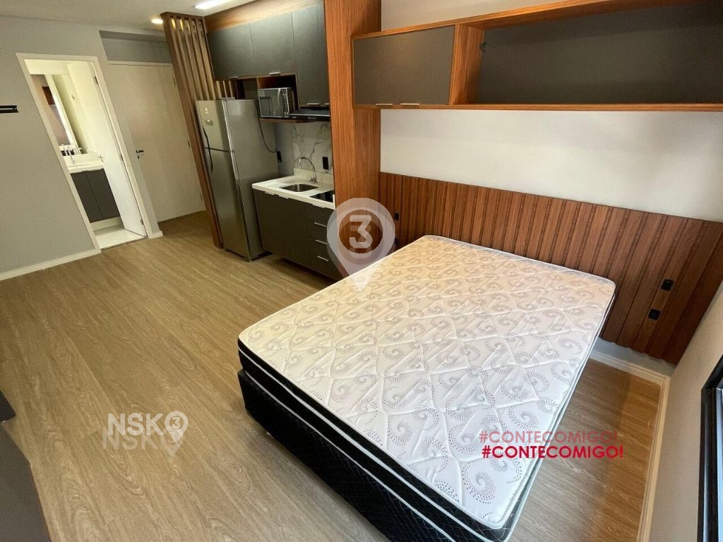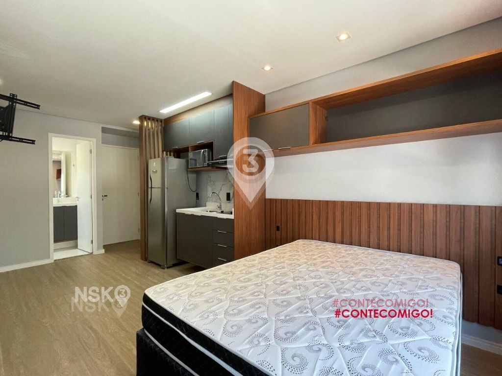 Studio para Locação com 24m². Novíssimo, Mobiliado, Equipado com Geladeira, micro-ondas, Fogão, Cama de casal, armários de cozinha e quarto, Televisor e bancada, banheiro com box blindex e gabinete.