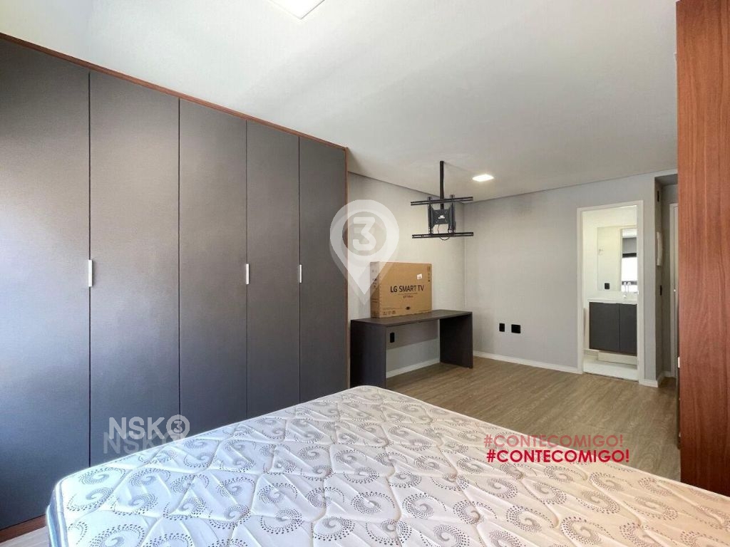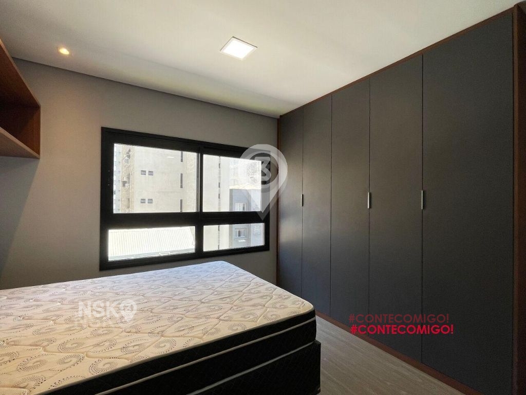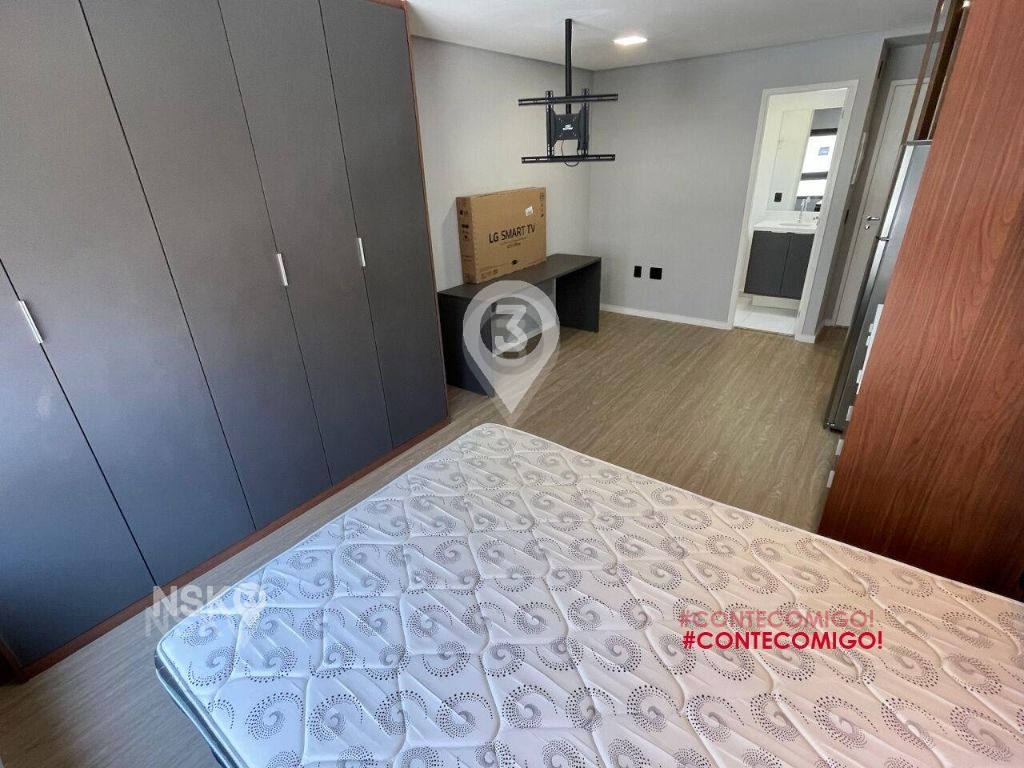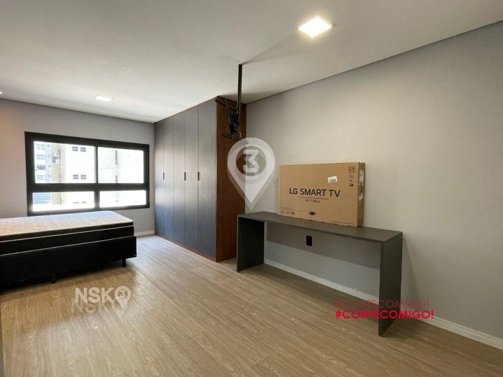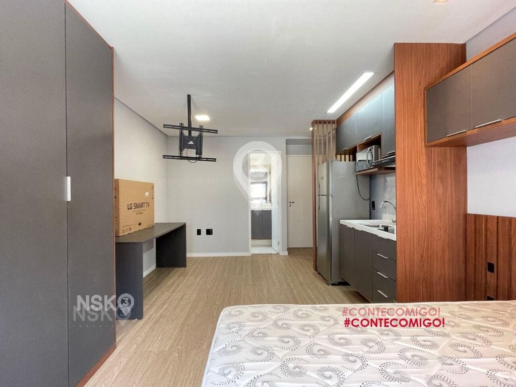 Studio para Locação com 24m². Novíssimo, Mobiliado, Equipado com Geladeira, micro-ondas, Fogão, Cama de casal, armários de cozinha e quarto, Televisor e bancada, banheiro com box blindex e gabinete.