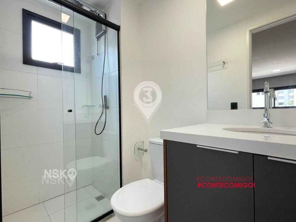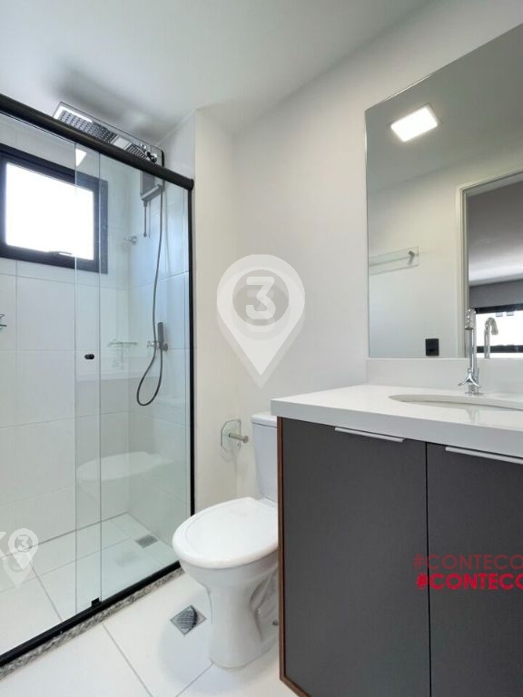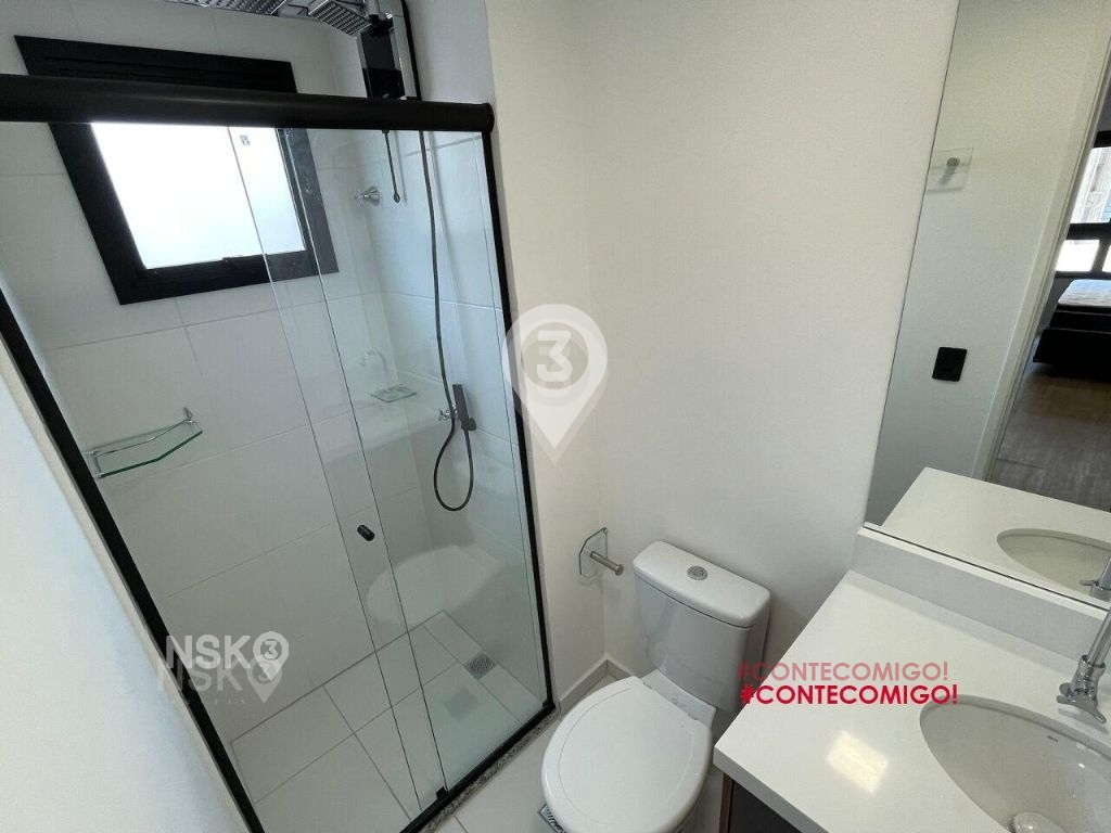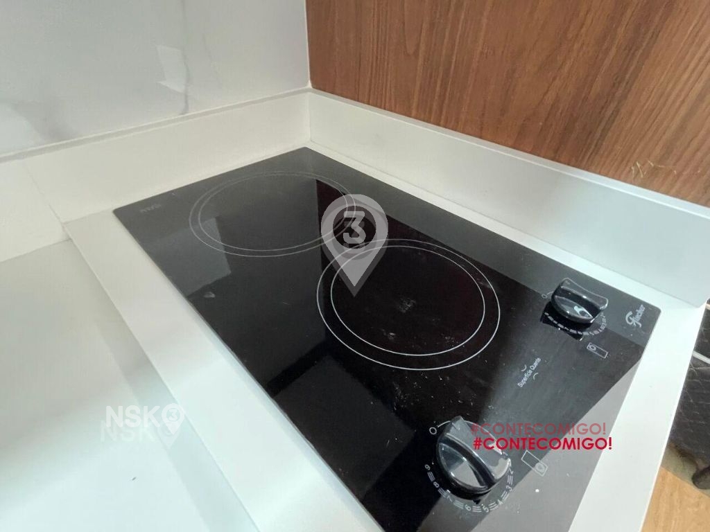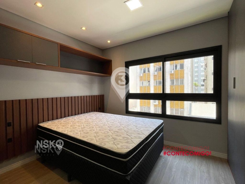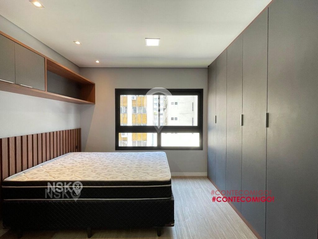 Studio para Locação com 24m². Novíssimo, Mobiliado, Equipado com Geladeira, micro-ondas, Fogão, Cama de casal, armários de cozinha e quarto, Televisor e bancada, banheiro com box blindex e gabinete.