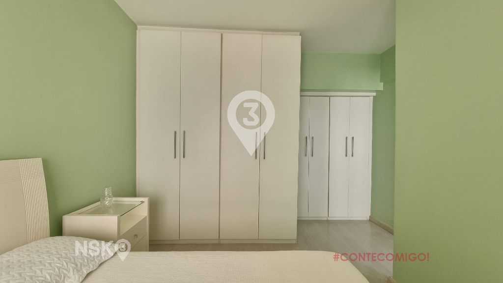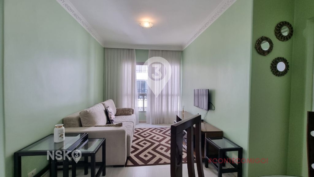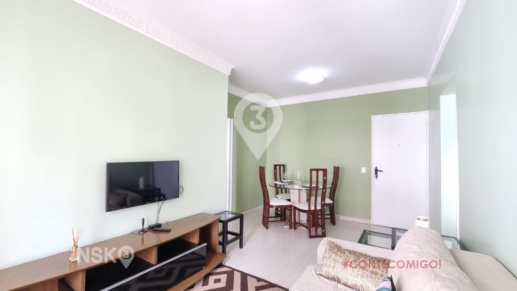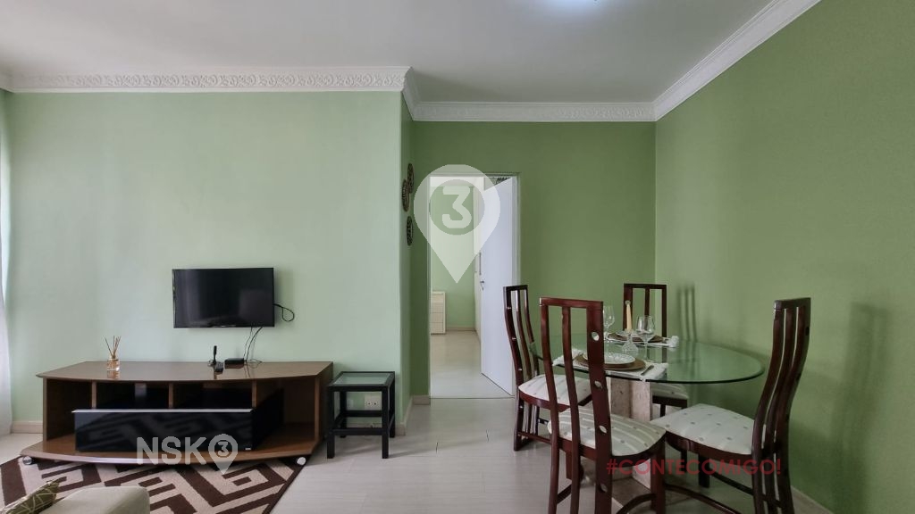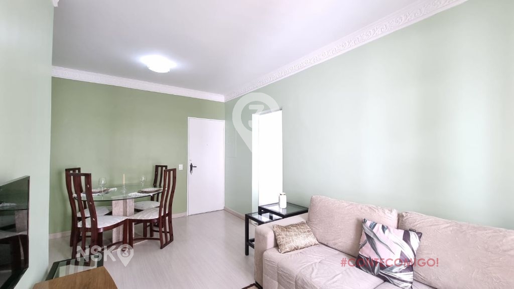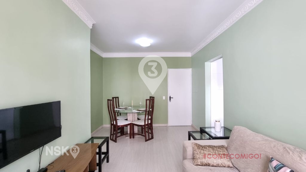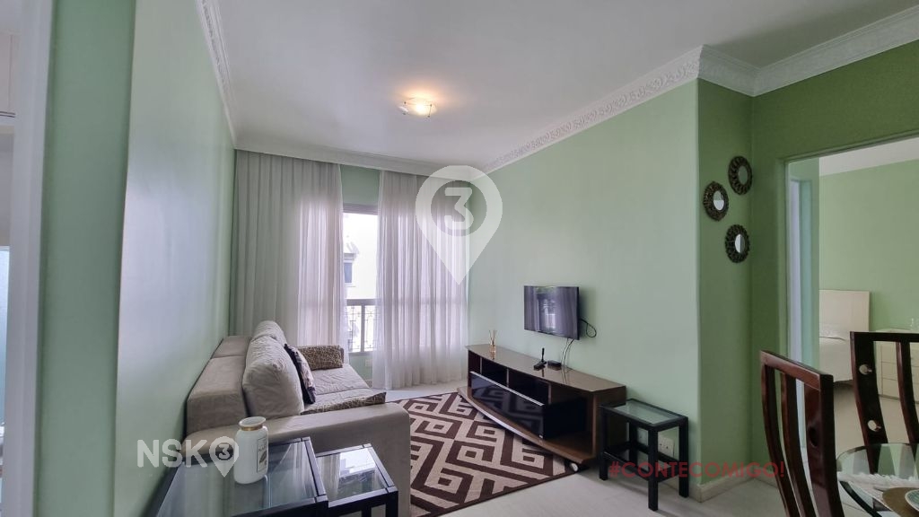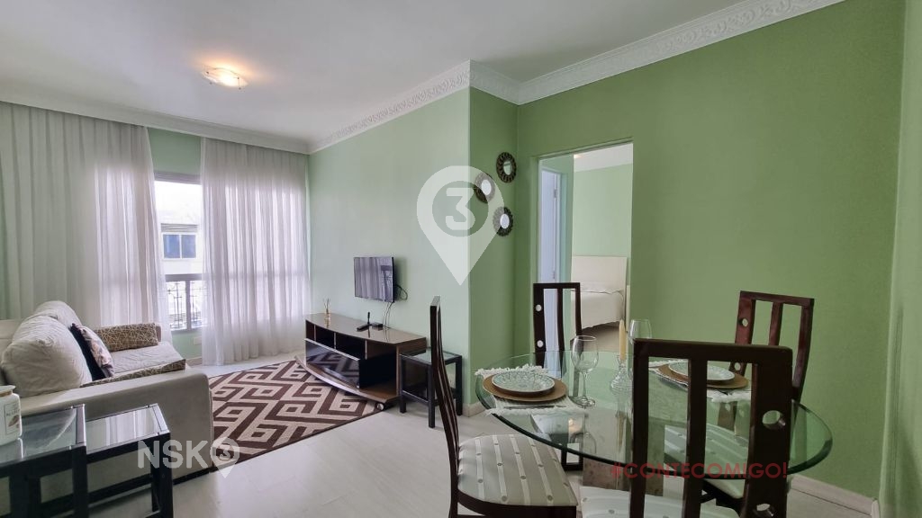 Possui 1 Quarto com armario e cama de casal, Sala para 2 ambientes com mesa de jantar e cadeiras, Sofá, rack e televisor, cozinha equipada com geladeira, fogão, armarios e area de serviços com maquina de lavar. Apartamento bem distribuido e com boa claridade.